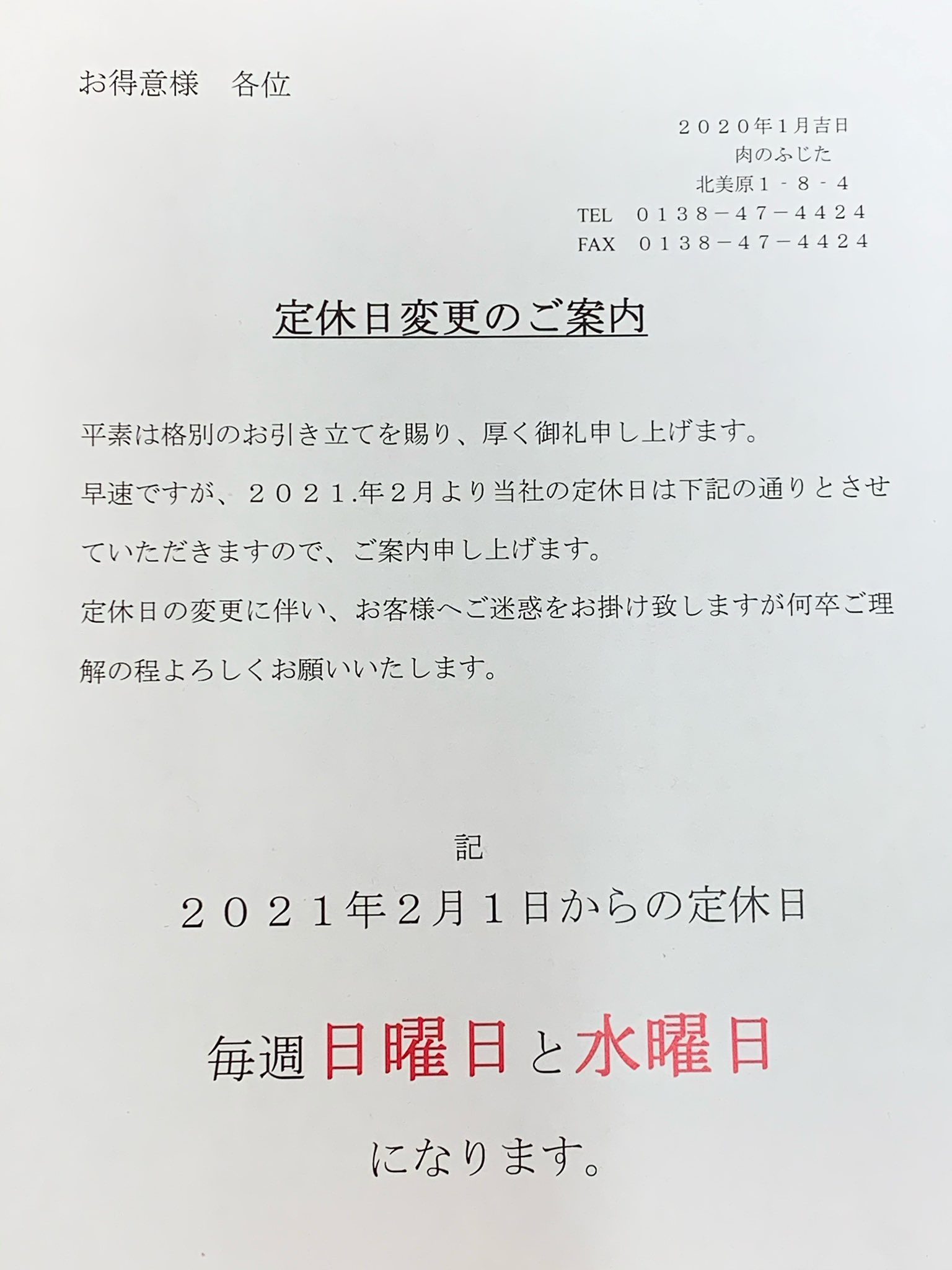 おはようございます😃数年前から検討しておりましたが、来月より定休日が変更になります。ご不便をお掛けすることもあろうかと思いますが、何卒ご理解ご協力の程よろしくお願い致します。